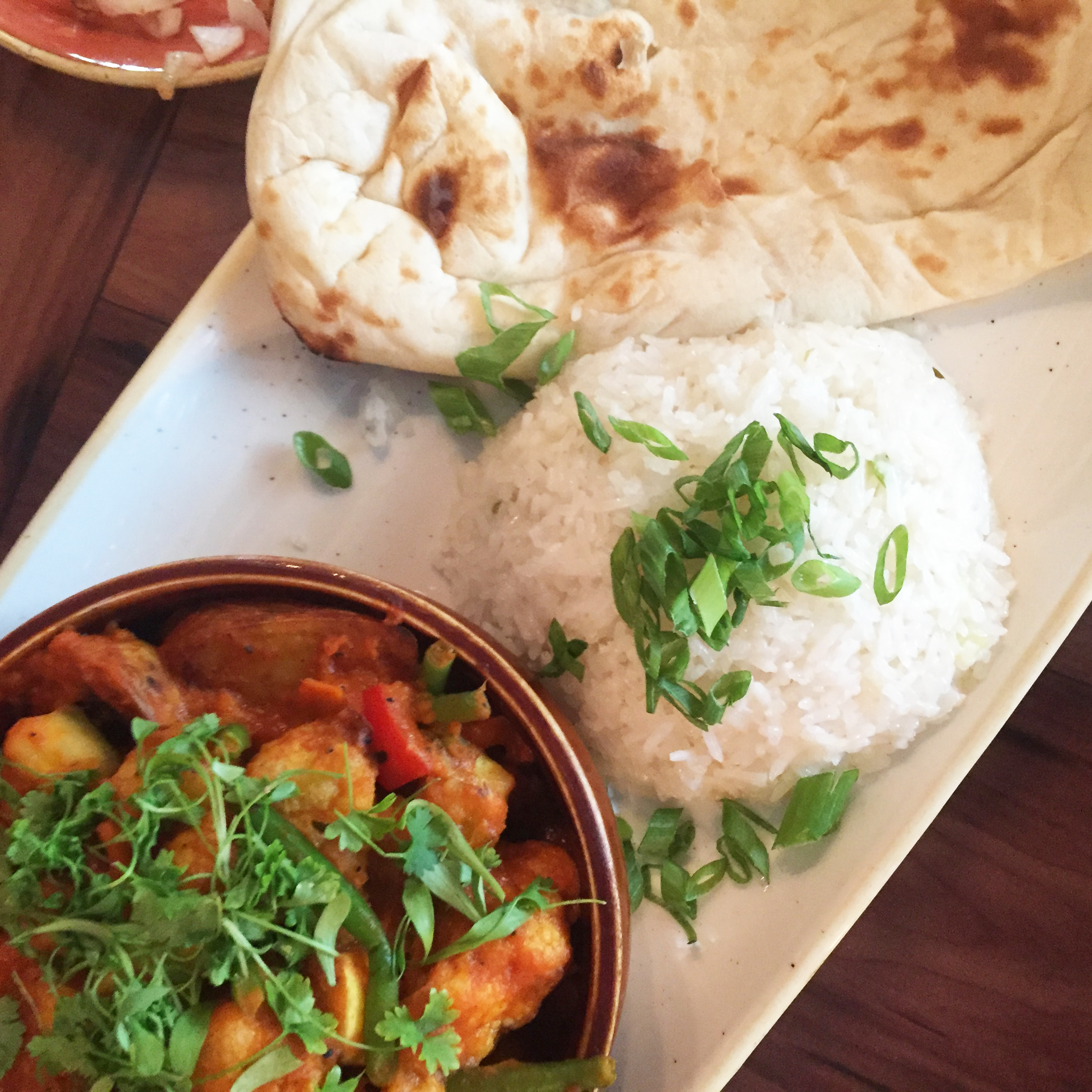 For entrees, my meat-eating friend chose the “A Lot at Steak” salad ($19), which was huge and loaded with tender slices of grilled steak, she barely left a dent in it by the end of the meal. My vegetarian friend went with the Curried Vegetable Crew Stew ($17) which smelled so good, we all had a bite or two. Cauliflower, potatoes, and a variety of other veggies were smothered in a delicious house-made curry, and served with fluffy coconut rice, and hot naan bread. I selected an appetizer as my entrée, the Shiriki Noodle Salad ($11); chilled rice noodles, loaded with edamame, micro-greens, red pepper, cucumber, green mango, and tossed in a sweet chili sauce—very refreshing!